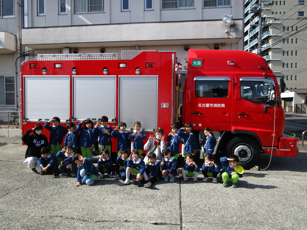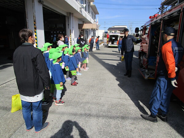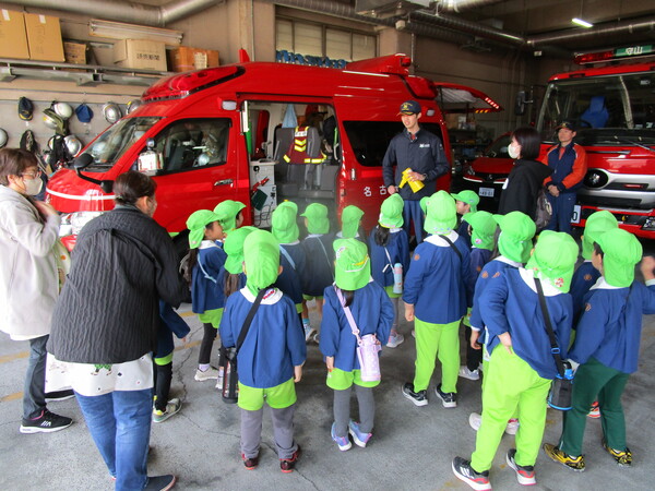 秋の火災予防運動にあわせて、年長さんが守山消防署の
