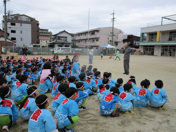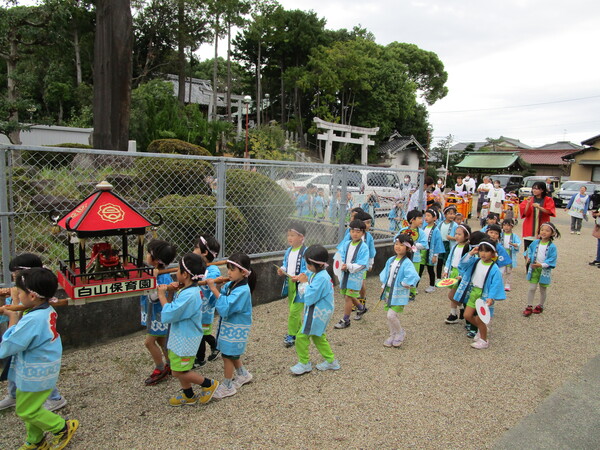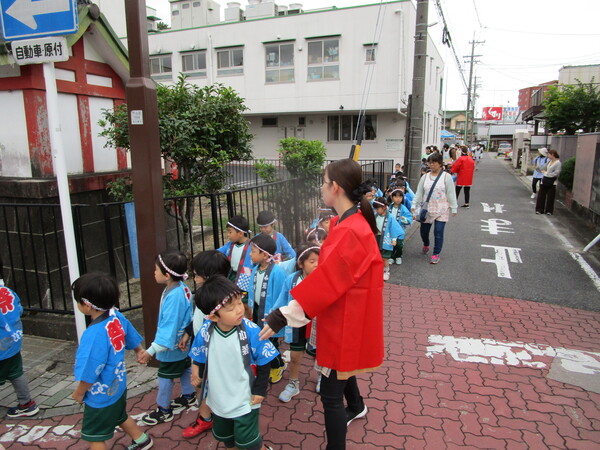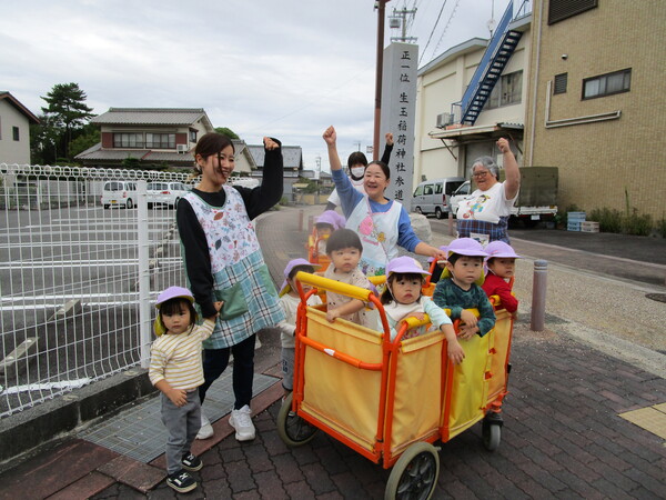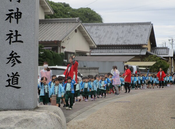 年長さんから乳児さんまで園児全員で保育園の隣の神社へお参りに行きました。