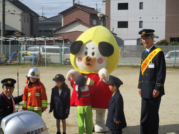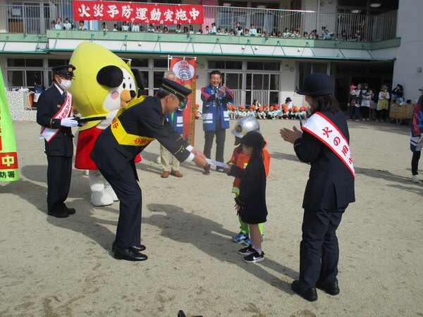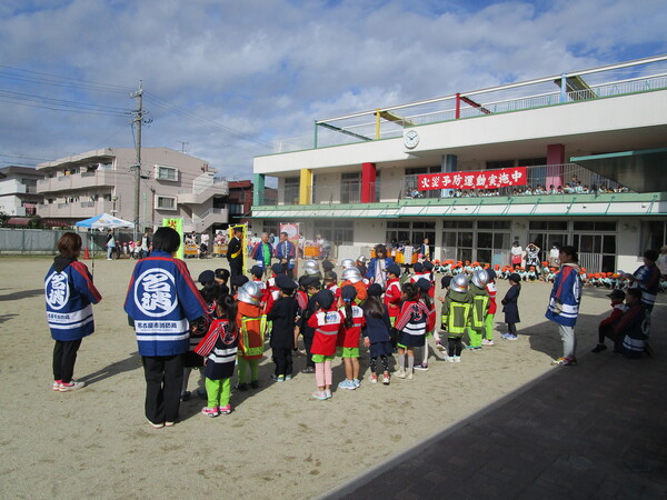 秋の火災予防運動にあわせて、年長さんが守山消防署の